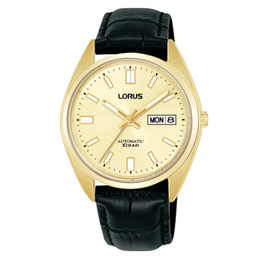 Reloj Lorus Hombre RL436CX9S Piel Negra Acero Dorado Automático. Caja de acero dorado de 39mm de diámetro. Bisel dorado. Correa de piel negra. Cierre hebilla. Esfera dorada. Multifunción, calendario. Cristal mineral. Movimiento automático Y676. Sumergible 100m. 3 años de garantía. Ref RL436CX9S