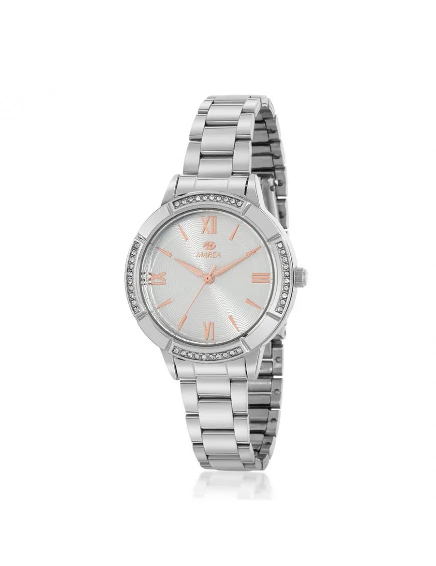 Reloj Marea Mujer B41370/1 Acero Analógico. Caja de acero de 34mm de diámetro. Bisel plateado con circonitas. Brazalete de acero inoxidable. Cierre desplegable. Esfera plateada. Cristal mineral. Movimiento quartz. Sumergible 30m. 3 años de garantía. Ref B41370/1