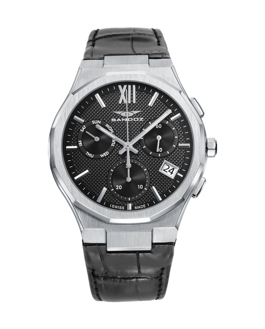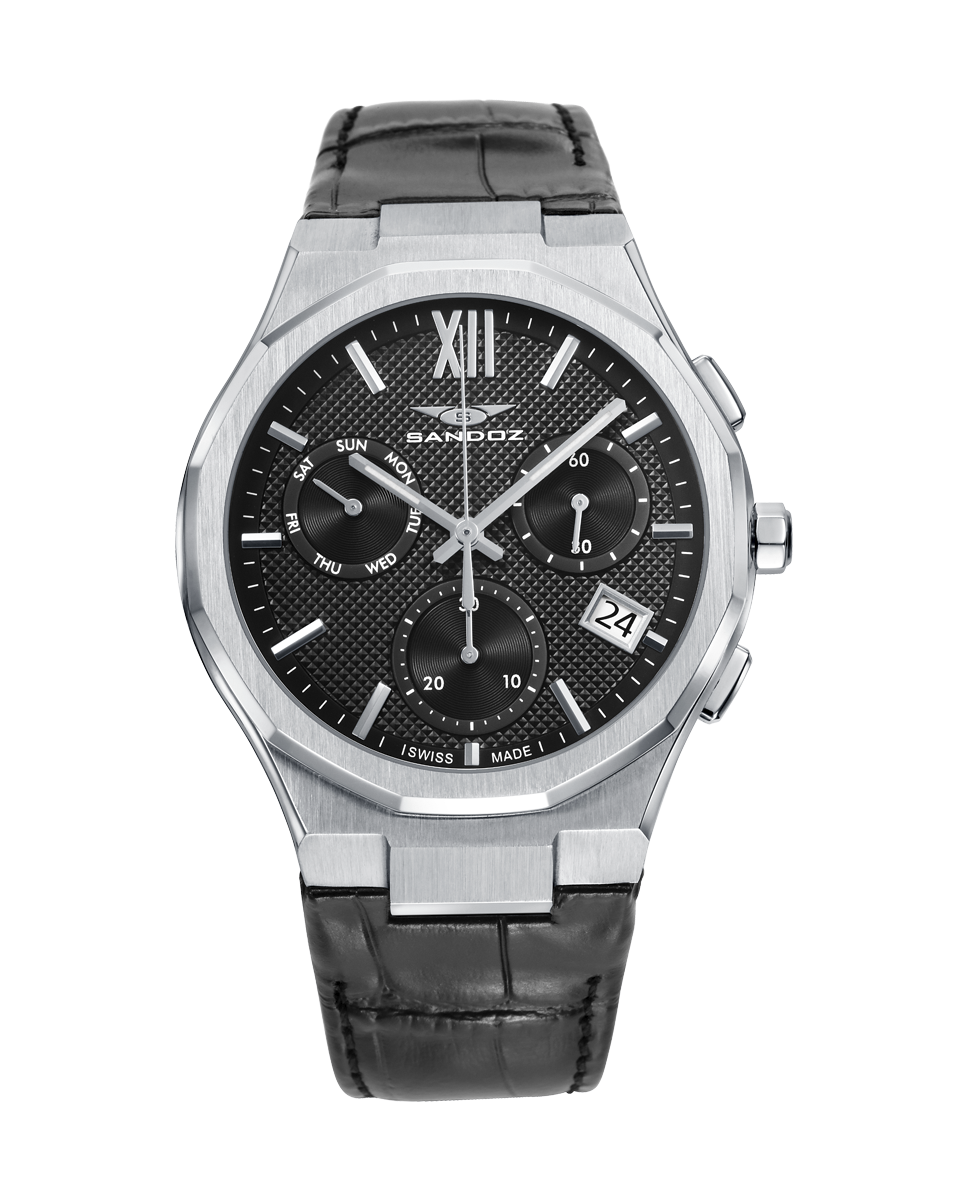 Reloj Sandoz Hombre 83015-53 Piel Negra Cronógrafo Analógico. Caja de acero plateado de 42mm de diámetro. Bisel plateado. Correa de piel negra. Cierre hebilla. Esfera negra. Multifunción, crconógrafo, calendario. Cristal zafiro. Movimiento quartz. Sumergible 100m. Swiss Made. 3 años de garantía. Ref 83015-53